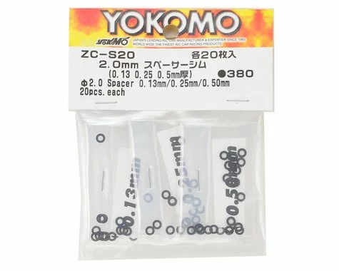 This is a Yokomo 2.0mm Shim Spacer Set. These shims come in three different thicknesses but all have a 2mm inner diameter and a 4mm outer diameter. Thicknesses included are 0.13mm, 0.25mm and 0.50mm, with twenty shims included in each thickness.