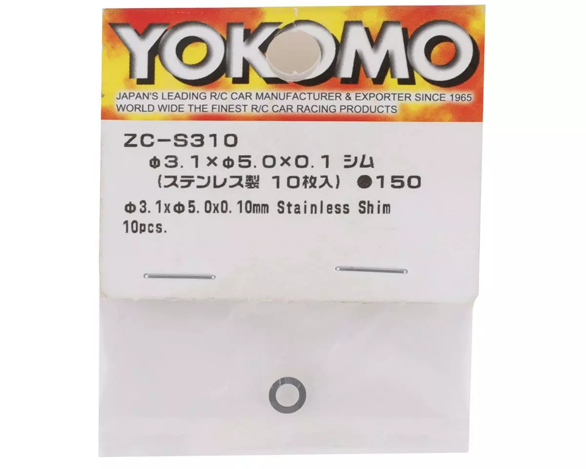 This is a pack of ten Yokomo 5×3.1×0.10mm Spacer Shims. These are a general-purpose spacer shim with an inner diameter of 3.1mm and a thickness of 0.1 mm.