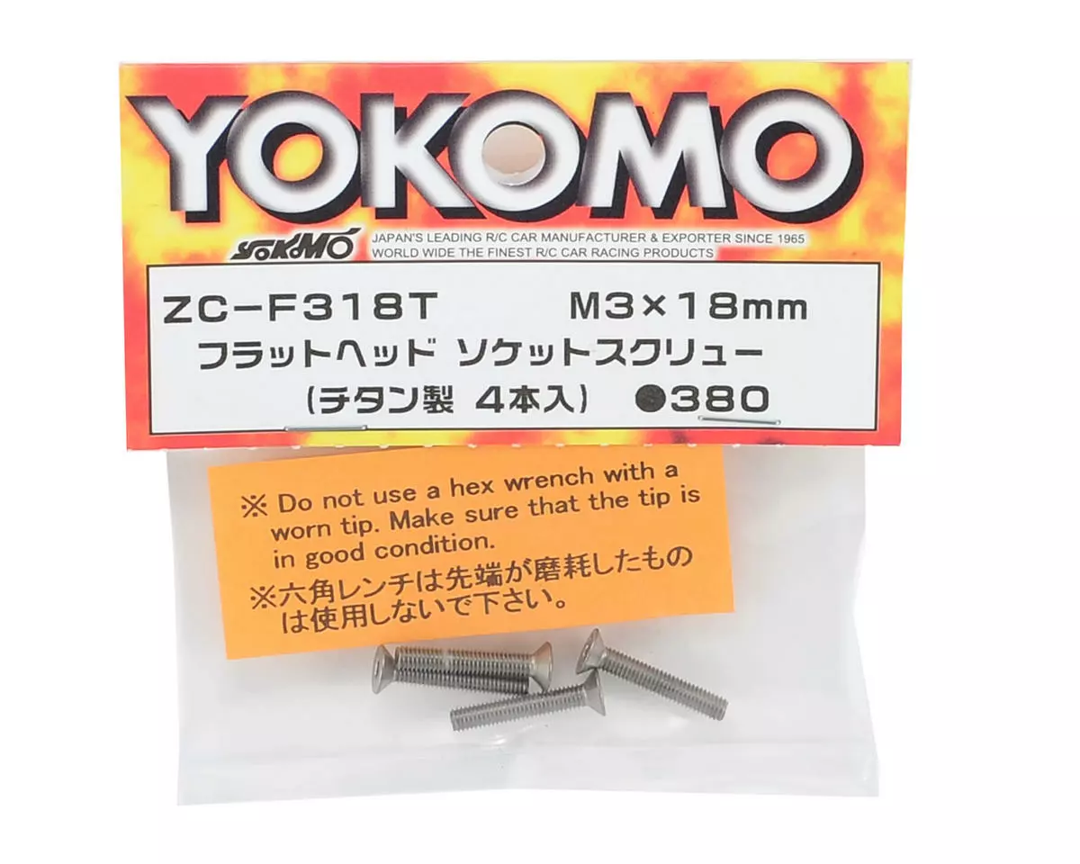 This is a pack of four optional Yokomo 3x18mm Titanium Flat Head Screws, and are intended for use with the Yokomo B-Max2 1/10 scale buggy.