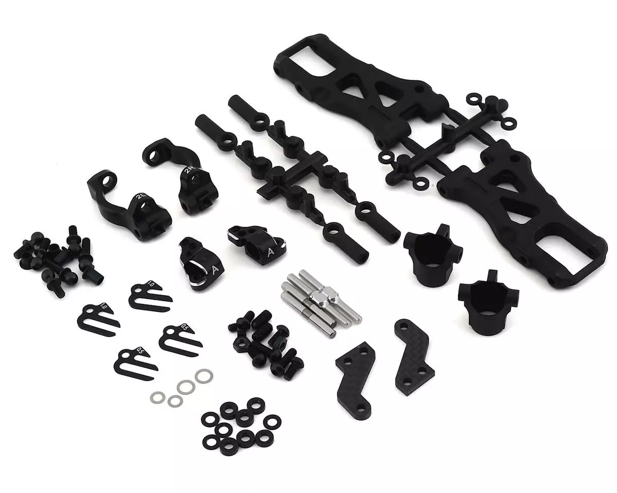 The Yokomo BD10 Rear Toe Control System is an ideal upgrade for tuning savy racers. The parts have been redesigned to significantly reduce weight. By changing the height of the rod that holds the hub carrier, you can make various settings from bump-in to bump-out. Additionally, compared to stock rear suspension, the inner suspension pin is set to be parallel, so the rear roll amount increases and traction increases, allowing faster corner speed.