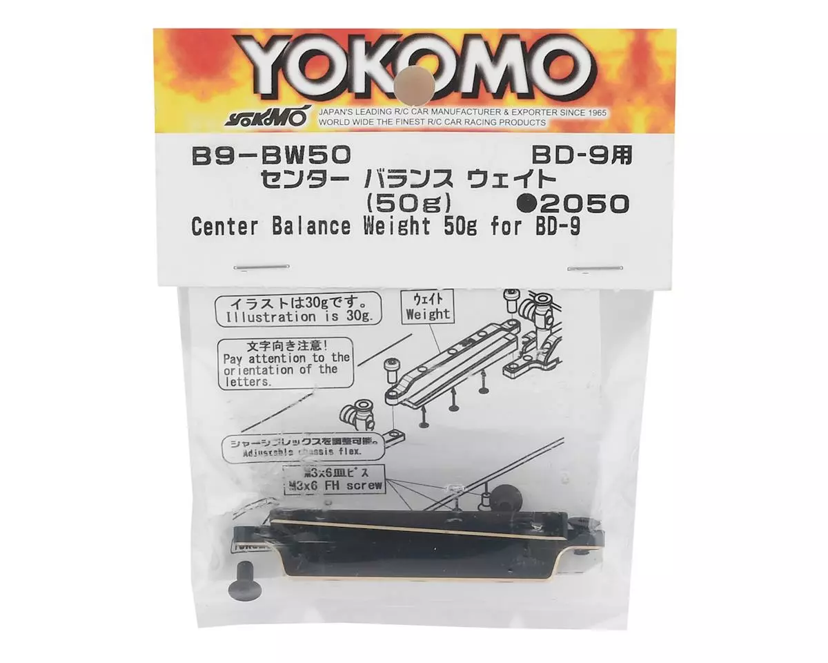 Yokomo BD9 Center Balance Weight. This optional chassis weight is installed down the center of the chassis, allowing you to tune the weight bias without destroying the overall balance of the chassis. Package includes one 50 gram chassis weight.