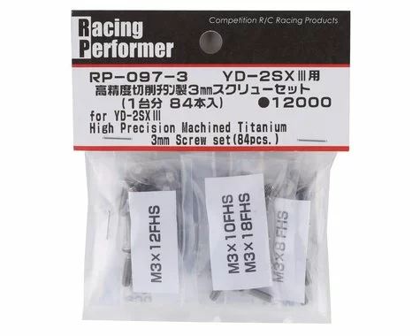 The Yokomo YD-2SXIII Racing Performer Titanium 3mm Screw Set is a high-precision titanium screw kit. These screws are precision cut on a central axis, helping to eliminate distortion when installing, enabling ultra-accurate assembly. Not only are these screws incredibly lightweight, but the screw head also has a brilliant finish to add a custom look. Package includes eighty four pieces of hardware, sorted by size. Refer to manual for specific screw locations.