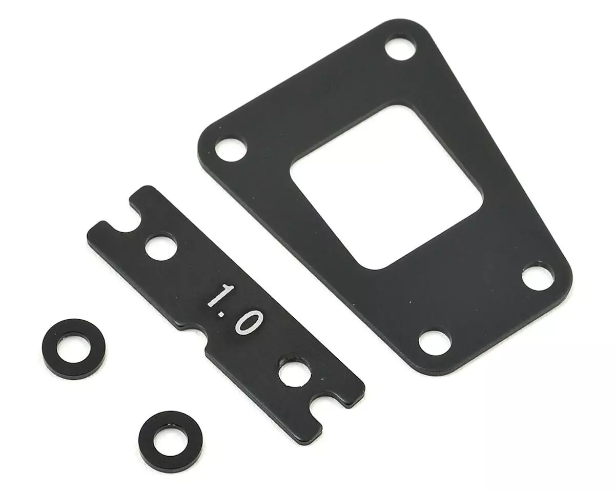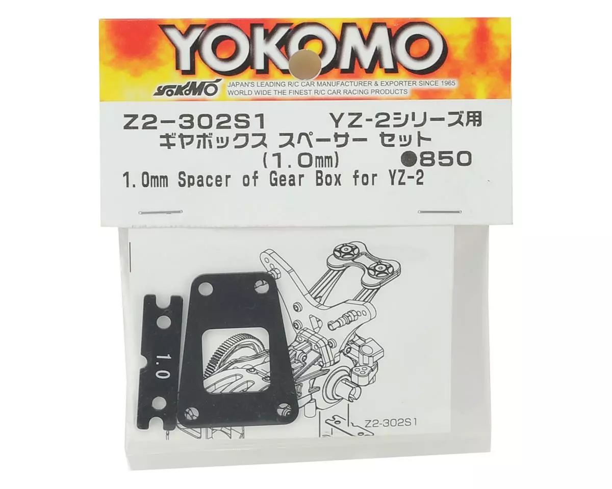 This is an optional Yokomo YZ-2 Gear Box Spacer Set for adjusting the rear roll balance by pinching the spacer under the gearbox of the YZ-2 series and changing the height of the gearbox. Set includes the main gearbox spacer, rear suspension mount spacer, and a spacer under the front waterfall brace. The thickness is 1mm each.