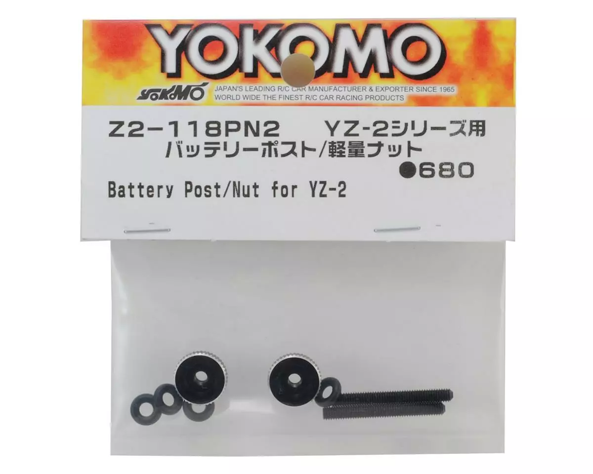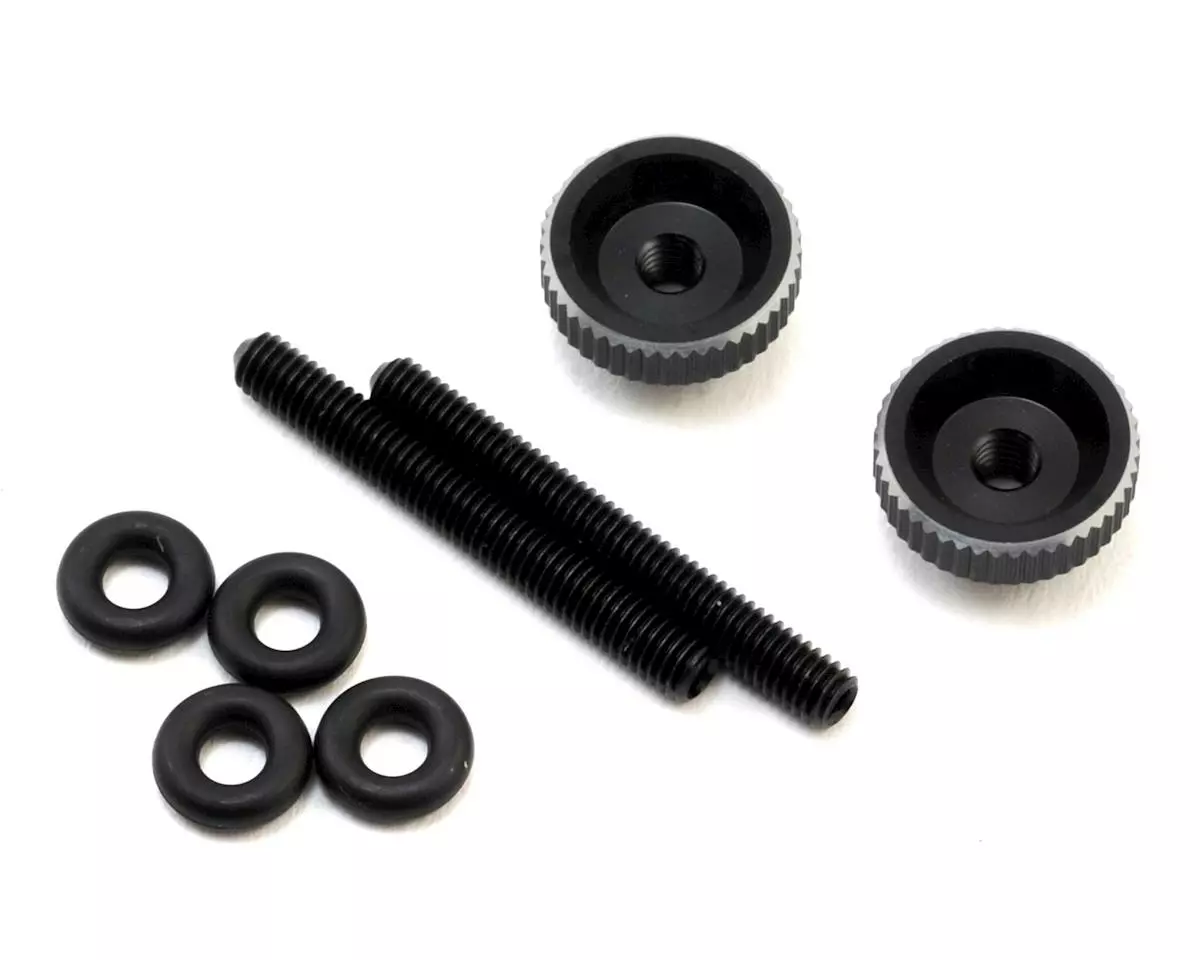 Yokomo YZ-2 Light Weight Battery Post Nuts. Package includes two battery strap hold down nuts, two set screws and four o-rings.